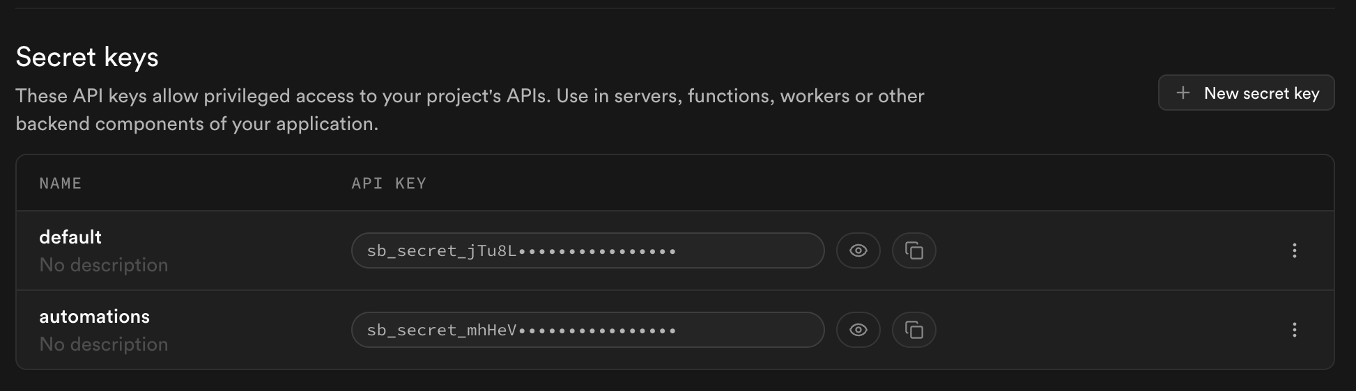 1import { withSupabase } from 'npm:@supabase/server'23export default {4 fetch: withSupabase({ allow: 'secret:automations' }, async (_req, ctx) => {5 // your business logic. ctx.supabaseAdmin bypasses RLS6 return Response.json({ ok: true })7 }),8}Create a named secret key for each caller in the Settings > API keys section of the Dashboard. Give it a name like "automations", and share the generated sb_secret_... value with the service that calls this function.