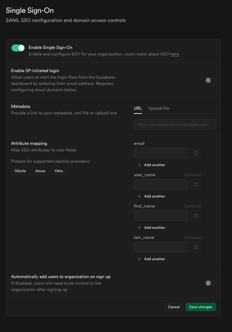 Supabase offers single sign-on (SSO) as a login option to provide additional account security for your team. This allows company administrators to enforce the use of an identity provider when logging into Supabase. SSO improves the onboarding and offboarding experience of the company as the employee only needs a single set of credentials to access third-party applications or tools which can also be revoked by an administrator.